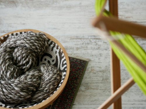 Lägg garnnystanet i skålen och dra tråden genom öppningen eller spiralen. Garnet rullar fritt medan du arbetar utan att falla ur skålen.